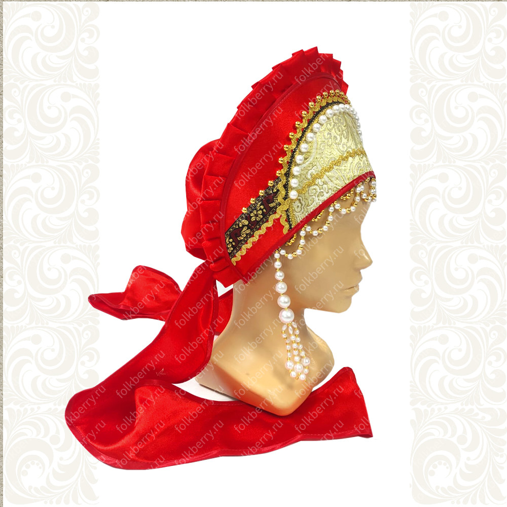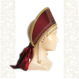 Кокошник выполнен из бархата (или атласа, на Ваш выбор), бусин белого и золотого цвета, пайеток, жаккардовой тесьмы, контрастной по цвету к фону.