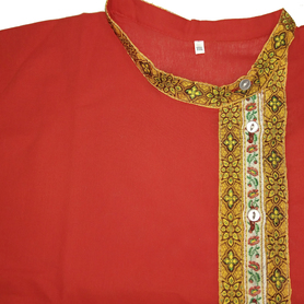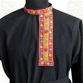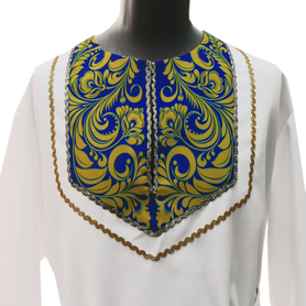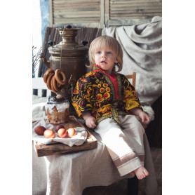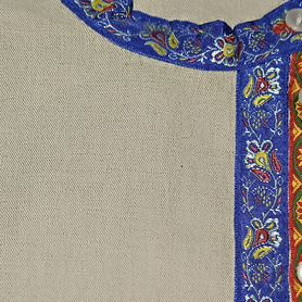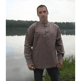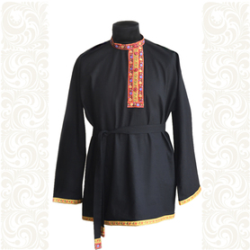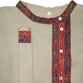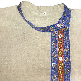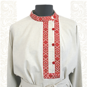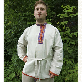 Косоворотка Оберег - выполнена из льна белого цвета, украшена жаккардовой лентой шириной 3 см синего цвета. Косоворотка смотрится стильно и современно, сочетается с современными элементами одежды, хотя содержит в себе элементы традиционного кроя и орнамента. В комплект входит пояс-кушак.