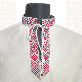 Косоворотка мужская "Православная" выполнена из небеленого льна и украшена народным геометрическим орнаментом в красных тонах. Планка, полики, пояс-кушак также выполнены из красного цвета.