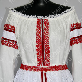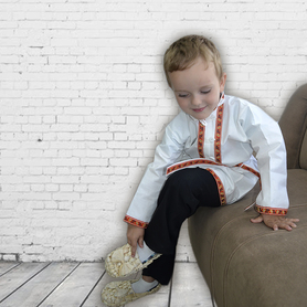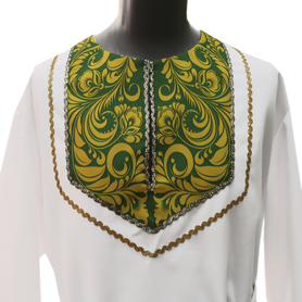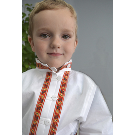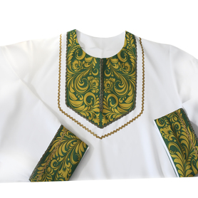 Русская народная рубаха (косоворотка) с кушаком. Изготовлена из хлопка, декорирована жаккардовой тесьмой. Яркий узнаваемый во всем мире рисунок "хохлома" и насыщенные цвета делают Косоворотку праздничной.