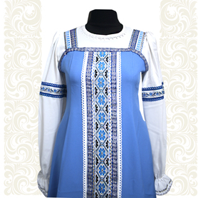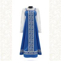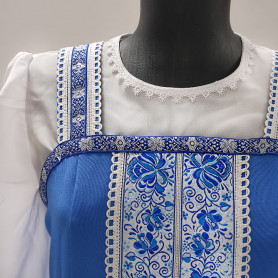 Выполненный в православном стиле сарафан с блузой «Дуняша» сшит из натурального хлопка в цветочек. Модель скромно декорирована однотонным воланом в цвет с основной тканью и тесьмой вьюнок. Можно носить под пояс и регулировать бретели по длине. Белая блузка из хлопка с длинным рукавом расшита натуральным нежным кружевом.
