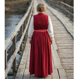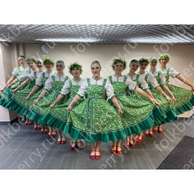 Костюм  выполнен из габардина и красиво подобранного декора в золотистых цветах. Достоинства габардина  в том, что он не мнется, не блестит, как атлас, ложится красивыми  мягкими складками, цвет не выгорает. Юбка  с оборкой, декор в золотистых цветах, по талии на  двойной резинке. Блуза  белого праздничного цвета, с баской,  рукава расширены внизу, с манжетами.   Сзади на блузе шнуровка. Она дает хорошую посадку по фигуре. Костюм предназначен для творческих  сольных и коллективных театральных выступлений.