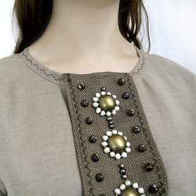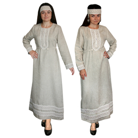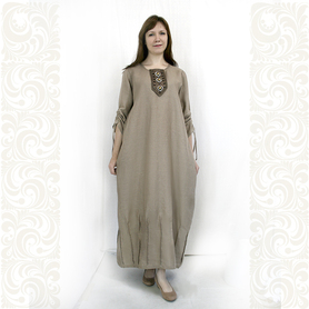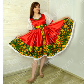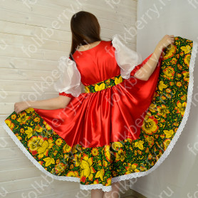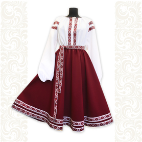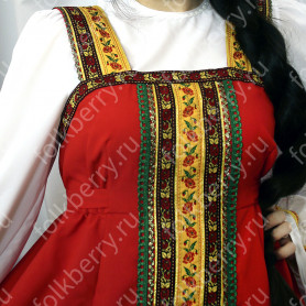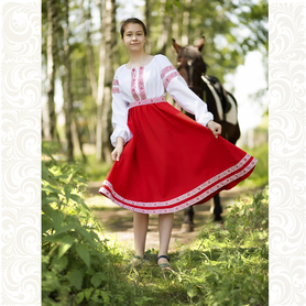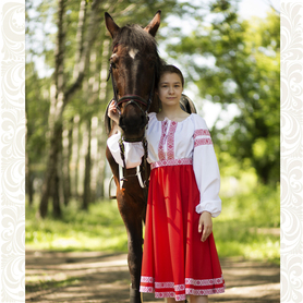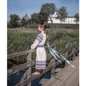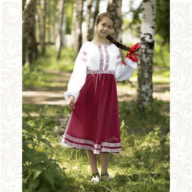 Платье «Дмитра» – отличный вариант наряда для тематических праздников  в детском саду и школе, православных и других мероприятиях. Платье  хорошо садится по фигуре и удобное в носке, благодаря регулируемой горловине, рукаву реглан, длинному поясу.  Юбка (почти солнце) длиной немного ниже колена эффектно смотрится при исполнении танца. Талия  немного завышена. Декор платья - жаккардовая тесьма с обережными символами. Платье шьется из габардина, из матовой, немнущейся ткани ярких цветов.