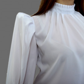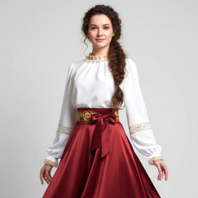 Платье сшито из яркого красного атласа и декорировано вставками с рисунком «хохлома». Юбка фасон полтора «солнца», подол и горловина украшены белым кружевом и тесьмой. Рукава «фонарики» сделаны из легкой, белой органзы.