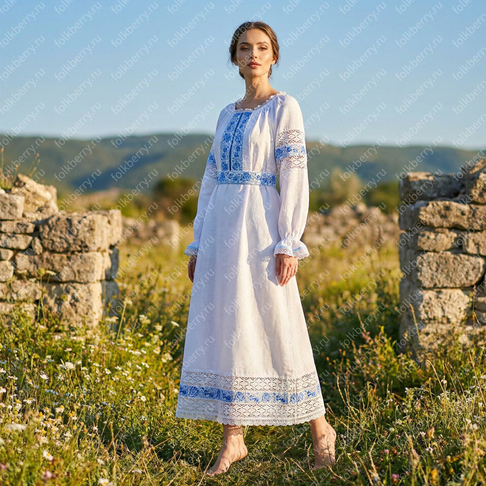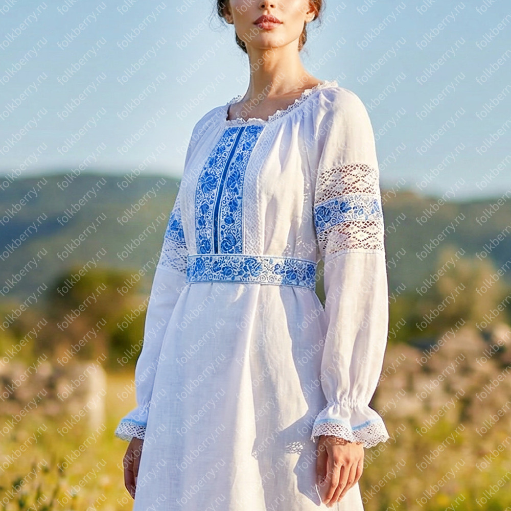 Платье «Кружевная Гжель» - женственный фольклорный наряд подойдет для особых случаев, например, для венчания или участия в славянских праздниках.