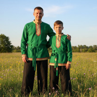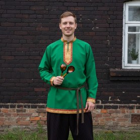 Русская народная рубаха (косоворотка) с кушаком. Изготовлена из хлопка, декорирована жаккардовой тесьмой. Яркий узнаваемый во всем мире рисунок "хохлома" и насыщенные цвета делают Косоворотку праздничной.
