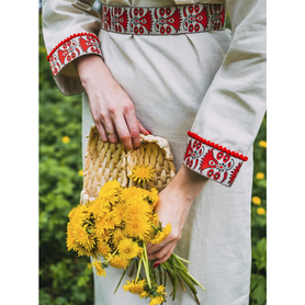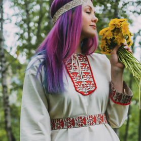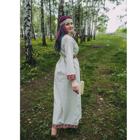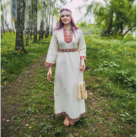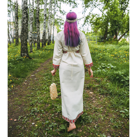 Рубаха женская "Славянская" удобная, красивая одежда, которая прошла проверку временем, потому что носили их женщины и девушки с незапамятных времен. Длинную рубаху надевали с сарафаном, с юбкой-поневой, с фартуком или носили отдельно как самостоятельный наряд. Рубаха с поликами, длинная, по бокам разрезы 30-40 см, выполнена из небеленого или белого льна, украшена декоративной тканной лентой шириной 5 см, с поясом в цвет декора. Для усиления образа, можно с рубахой надевать славянский традиционный тканный пояс и очелье ( повязка на голову)