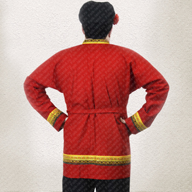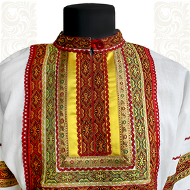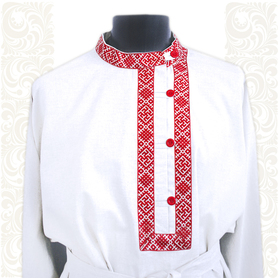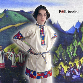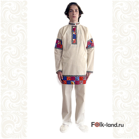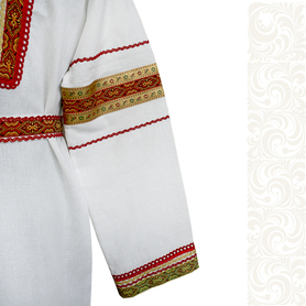 Мужская рубаха «Истоки» выполнена из хбелого льна, имеет втачной рукав. По низу изделия, вороту и рукавам расположена жаккардовая тесьма с обережным рисунком. Дополняет рубаху кушак (пояс) из ткани с тесьмой.