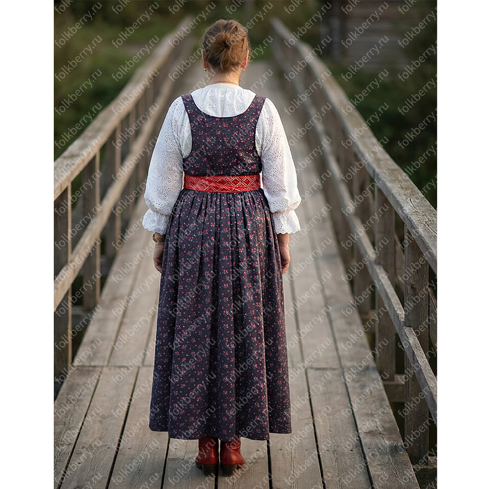 Сарафан: 100% хлопок с историческим синим цветочным принтом восстановленным на Шуйском ткацком производстве;