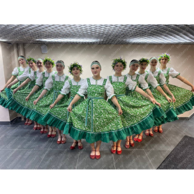 Выполненный в православном стиле сарафан с блузой «Русь» сшит из натурального хлопка в цветочек. Модель скромно декорирована однотонным воланом в цвет с основной тканью и тесьмой вьюнок. Можно носить под пояс и регулировать бретели по длине. Белая блузка из хлопка с длинным рукавом расшита натуральным нежным кружевом.