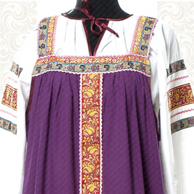 Приталенная модель хорошо сидит по фигуре, расклешенная книзу дает крупные мягкие волны. Сзади расположена застежка «молния». Талия дополнительно подчеркивается поясом. Плечики регулируются по длине. Сарафан украшен широкой полосой из жаккардовой тесьмы, вьюнка, золотистого шнура, кружева.