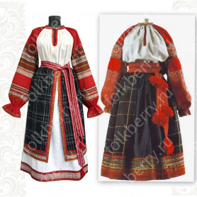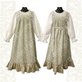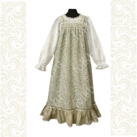 Сарафан состоит из кокетки спереди и сзади; бретелей, которые можно регулировать по длине; юбки-солнце средней длины с пышной оборкой. Сарафан выполнен из ткани габардин и украшен жаккардовой тесьмой, вьюнчиком.