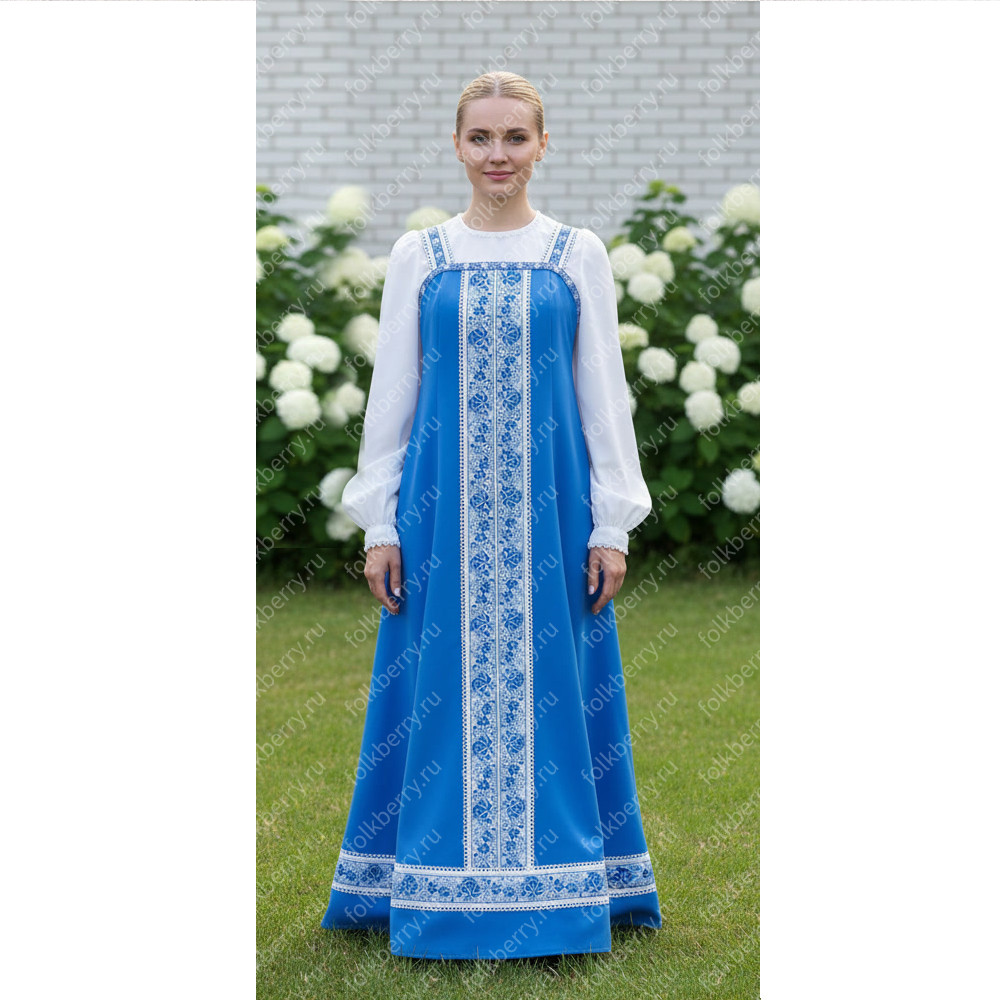 Сарафан с блузой Красна девица в голубом цвете – очень женственная модель русского сарафана. Вверху сарафан идеально облегает грудь, мягко облегает талию, плавно расклешается до 3 метров в диаметре внизу.