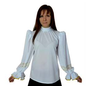 Блуза сшита из белого крепдешина. Рукава пышные с воланами на запястьях. Возможен пошив из хлопка или атласа.
