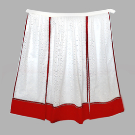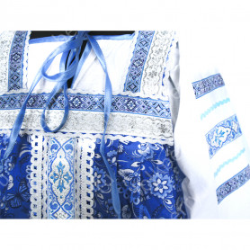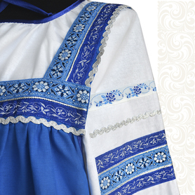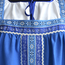 Сарафан выполнен из плотного, габардина. Красивая посадка, к низу расклешен. Бретели регулируются. Главное украшение сарафана – широкий декор внизу, выполненный из жаккардовой тесьмы разной ширины и цвета, из золотистого шнура, тесьмы вьюнок и кружева. Все элементы идеально подобраны по цвету и создают красивый ансамбль.